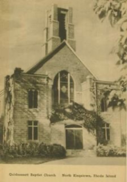 This is a picture from the historic village of Quidnessett. It is a picture of the Quidnessett Baptist Church, in North Kingstown, Rhode Island, a gathering place for believers since June 2, 1828. Its history is rooted in strong community, biblical teaching, and steady growth over nearly 200 years. Originally established as a branch, it formally became an independent church, erecting a "Union Meeting House" in 1829.